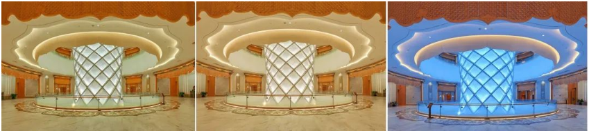 在项目设计之初,就通过与法师、运营及相关单位的沟通,确认了公共空间的游客路线,以及使用功能,并以此明确了灯光需要满足宗教仪式感、游览安全性、演绎动态化、会议活动等不同场景需求,除了在满足相关标准的数据化规范,通过与文化专家、艺术专家的沟通,明确了静态灯光场景下,采用白色(代表观音文化)、蓝色(代表普陀山文化)、金色(代表佛教文化)这二个主基调,进行空间灯光氛围营造。
