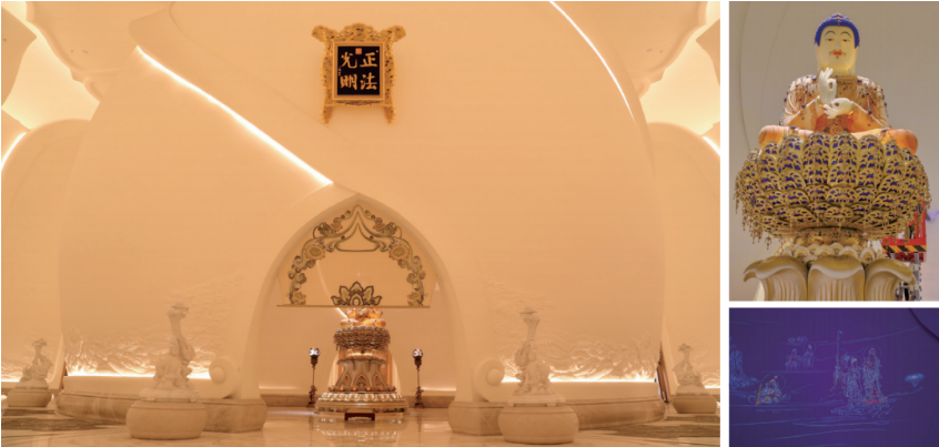 九层正法光明阁为圣坛重要的精神空间,整体结构犹如朵白净的莲花花苞,花苞内中心供奉正法明如来,照明设计结合玉佛的材质特性采用内透结合外部投光的方式实现整体照明;花苞内墙面绘有三十三天和二十八部众佛荧光画,采用特殊定制的380nm紫外灯具来激发荧光画。此空间结合音乐设置灯光演绎场景,灯光由暖色暗氛闱到紫光氛围再到白光的大放光明的动态变化,体验次关于受佛陀感化到光明普照的心理历程。