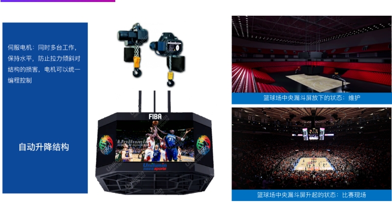 譬如在户内体育馆,洲明拥有斗屏、看台屏、围栏屏等丰富的LED产品线。产品以客户为中心,透露设计巧思,如中央的漏斗屏箱体重量轻、承重结构钢材轻,且设计为可以自动升降的结构,便于安装和维护。