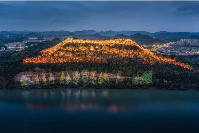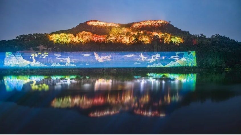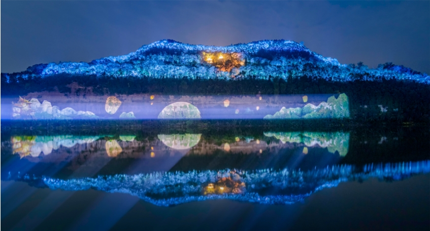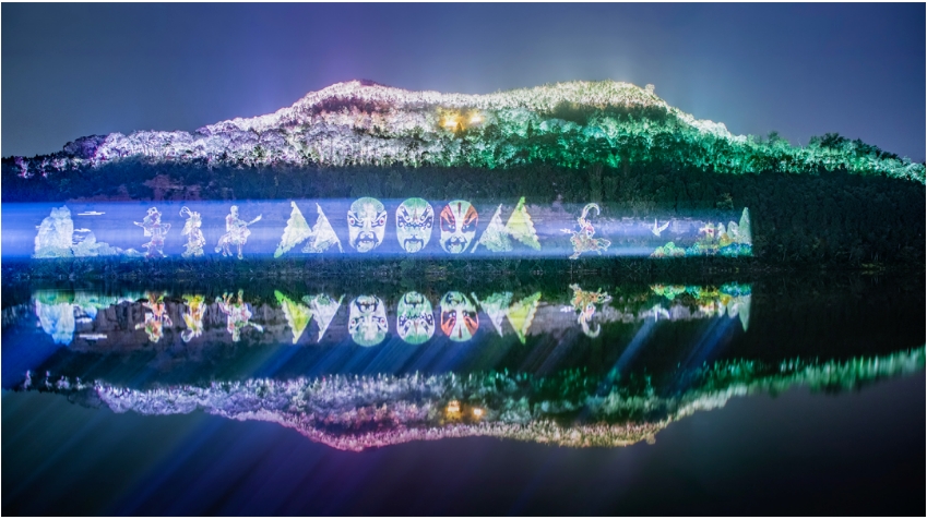 在锦屏山的天然帷幕前,采用了映画机远距离投射在崖壁上,巧妙地利用岩体的凹凸、植被的位置,借景发挥设计了4个不同主题的灯光秀展现阆中的风土人情,叙说这座千年古城的历史文化、生活习俗等城市色彩,远观有气势、近看有气质、细读有故事。