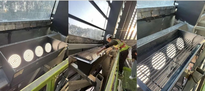 天花大部分位置的补光,是通过在吊环顶部安装了吊环上照投光灯来实现的。天花中间的光不需要很强。同时,天花又有一定的倾斜度。因此我们根据不同位置选择了三种不同参数的灯具:分别是20瓦24度角、20瓦50度角和40瓦50度角的灯具。共有73套,均匀布置在吊环顶部,0~10V的调光系统可以对其进行场景设置。
